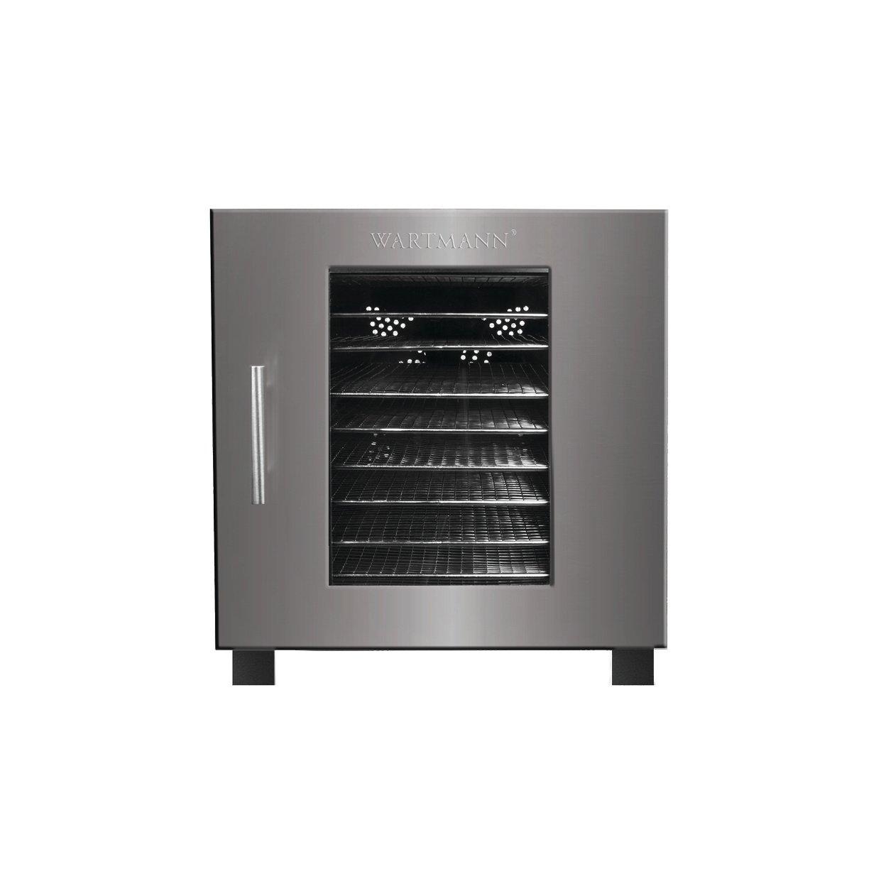 Металева сушарка для фруктів Wartmann WM-1902 DH обладнана місткими 10-лотками та міцним корпусом із неіржавкої сталі з віконними дверцятами. Загальна площа дегідратора становить 1,12 квадратних метрів, що дає змогу висушувати до 10 кг продуктів за один раз.
